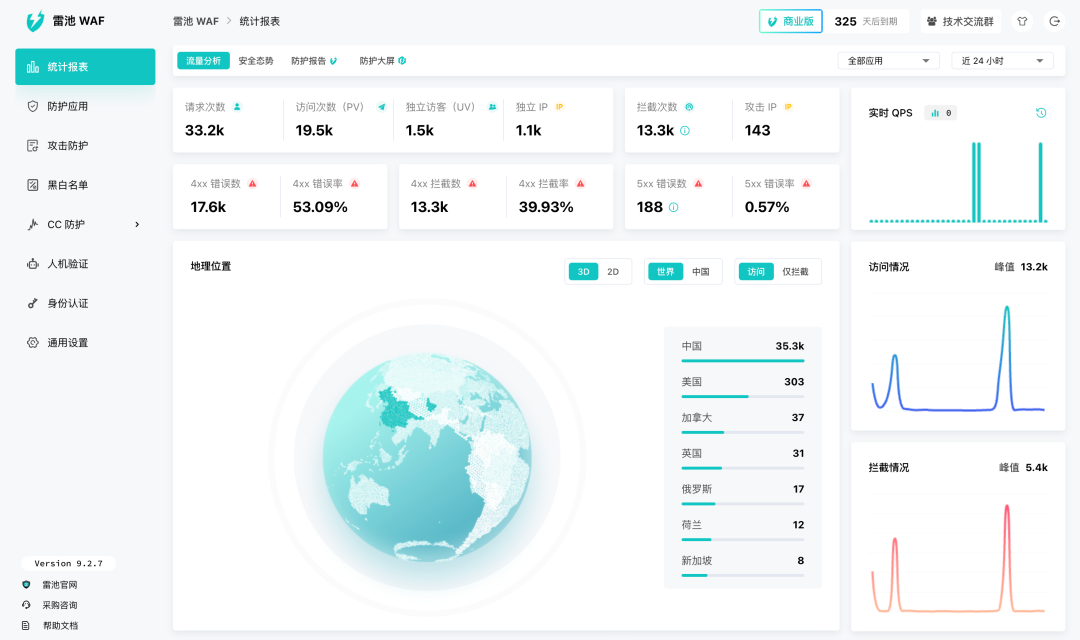 它把攻击来源、流量趋势、拦截详情、黑白名单、防护应用等等信息都做成了可视化的图表。