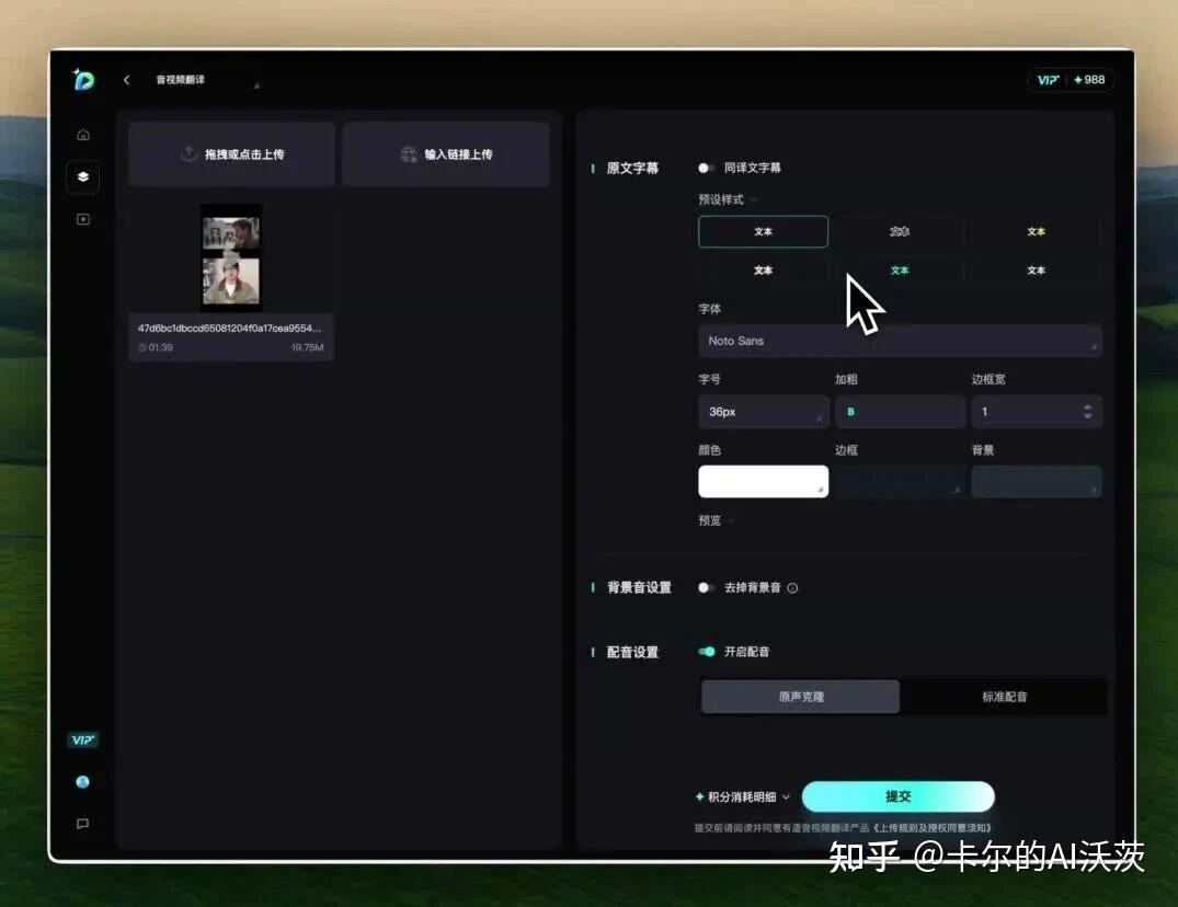 好吧,第一步是打开网易有道音视频翻译,选好视频的原语言和目标语言,选择VF原声翻译,设置双语字幕的时候,横屏字幕大小推荐48px/52px,竖屏推荐36px/48px,配音设置一定要选原声克隆。