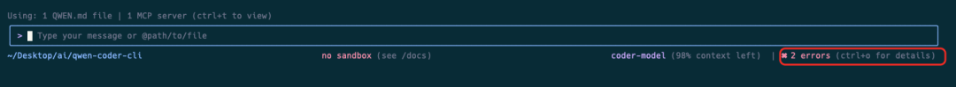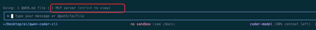 Qwen Code CLI新增了MCP服务快捷键快速查看功能,配置完MCP服务后,可以看到聊天框上方多了一个提示