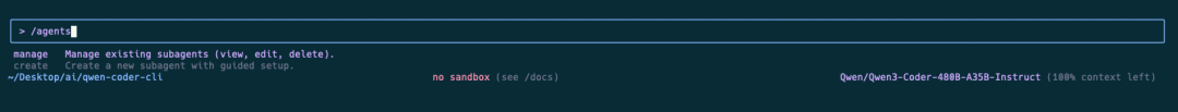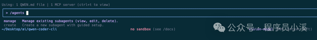 Qwen Code CLI支持子代理功能,在交互式命令中输入 /agents可以查看Agents菜单