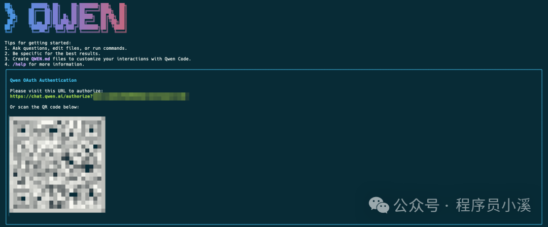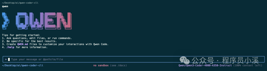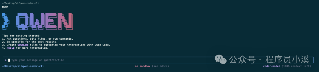 Qwen Code CLI安装完成后,在命令行终端输入 qwen 启动CLI,启动后界面如下: