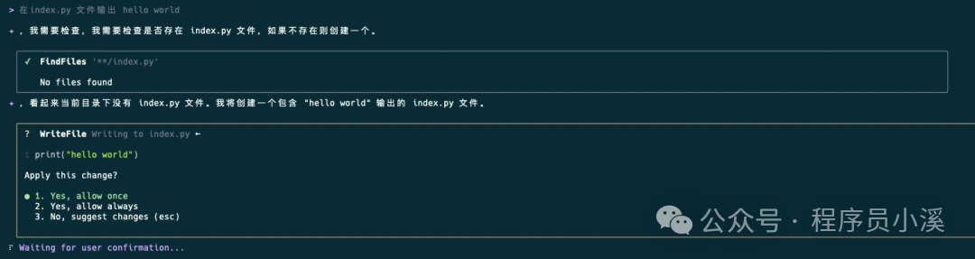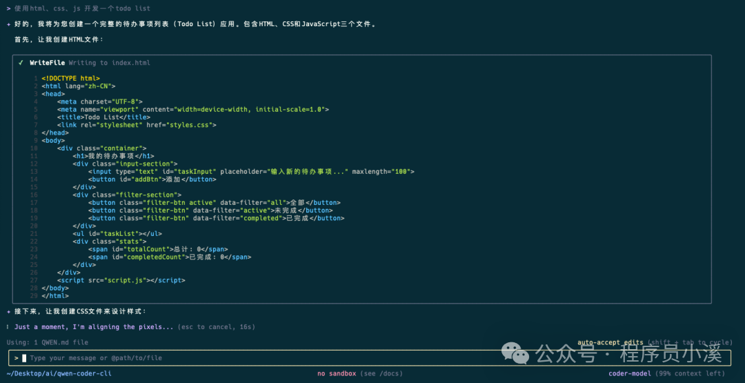 当我们切换到【auto-accept edits】模式时,再次执行同一个任务时,Qwen Code CLI会直接进行文件编辑任务