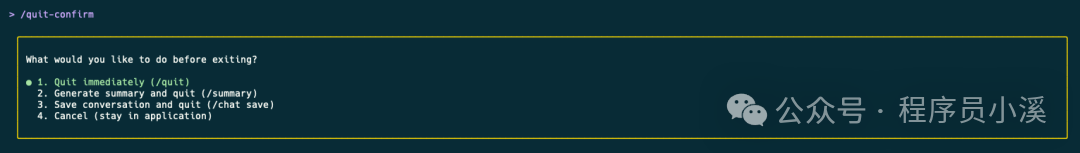 Qwen Code CLI新增的交互式命令,用于退出 Qwen Code 前显示确认对话框,允许你选择如何处理当前会话。