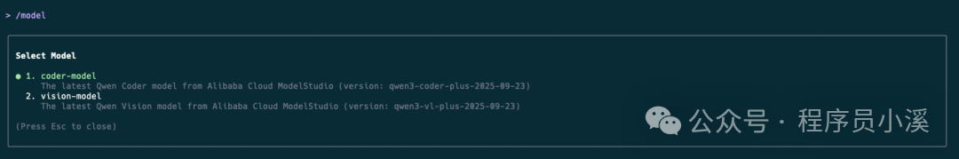 使用【Qwen OAuth】方式授权,在交互式命令中调用 /model命令可以看到除了 coder-model 模型,还提供了一个 vision-model 视觉模型