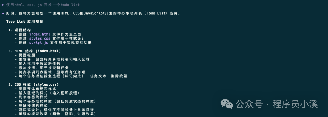 当我们切换到【plan mode】模式发起一个任务时,Qwen Code CLI会对任务进行分析和规划,但是并不会执行计划,而是会提示我们切换到【auto-accept】模式