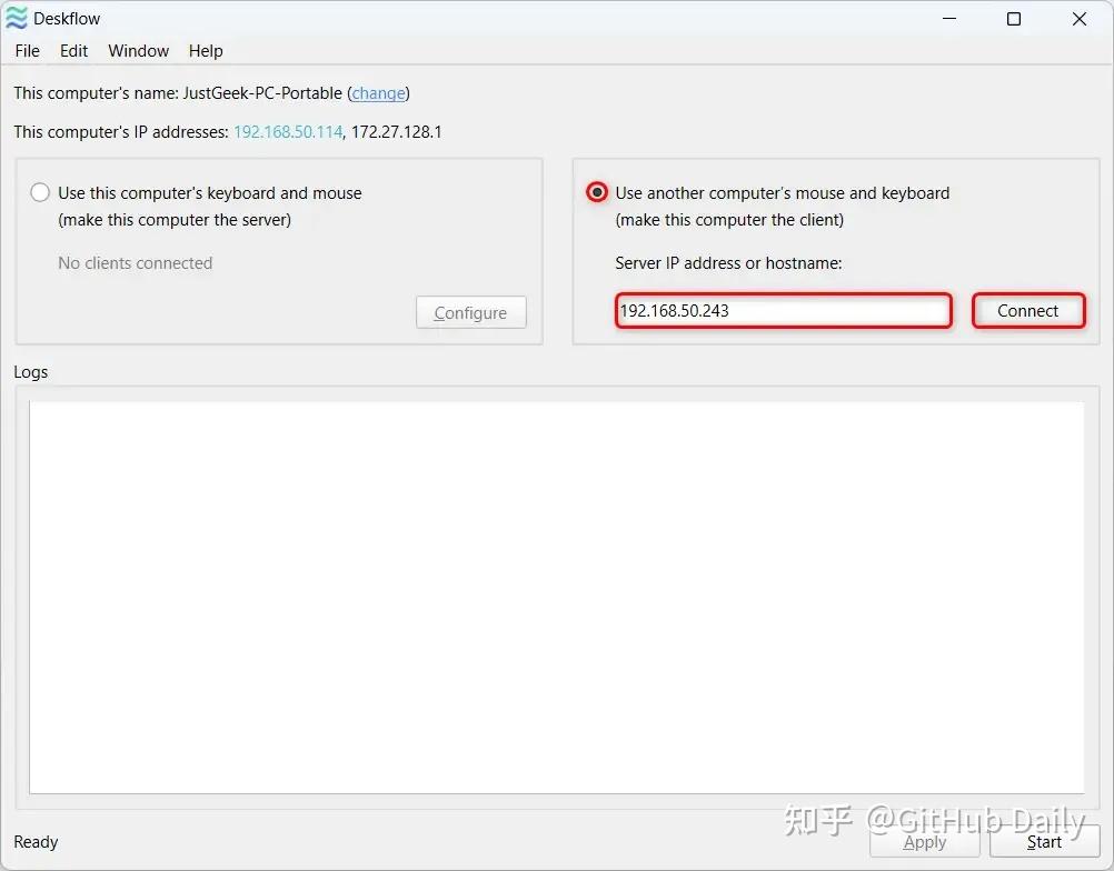 然后,在另一台电脑上,同样安装 Deskflow 并打开,选择作为客户端,并填入服务端的 IP 地址: