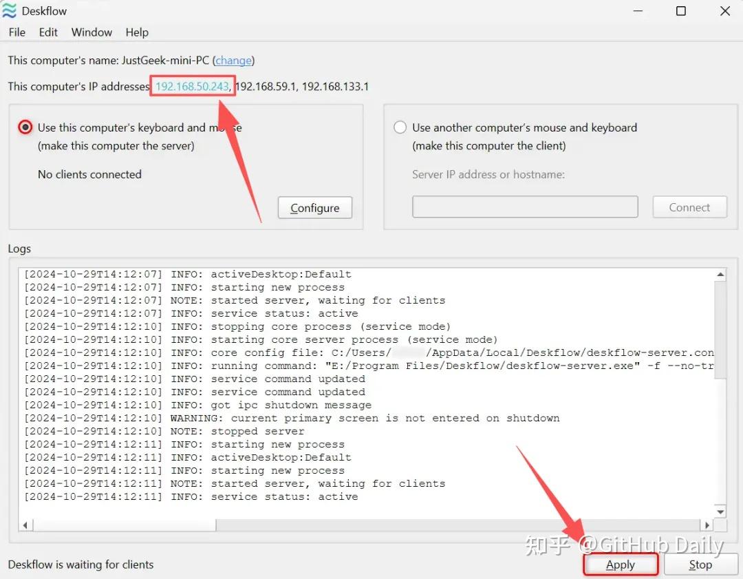 比如我们先给插着键盘鼠标的电脑,安装 Deskflow 后并打开,同意作为服务端,并记住 IP 地址: