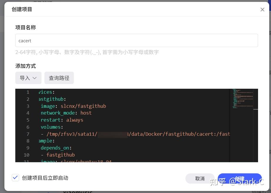 🔺在新增项目页面自定义项目名称,输入以下 Docker Compose 配置信息后点“创建”按钮: