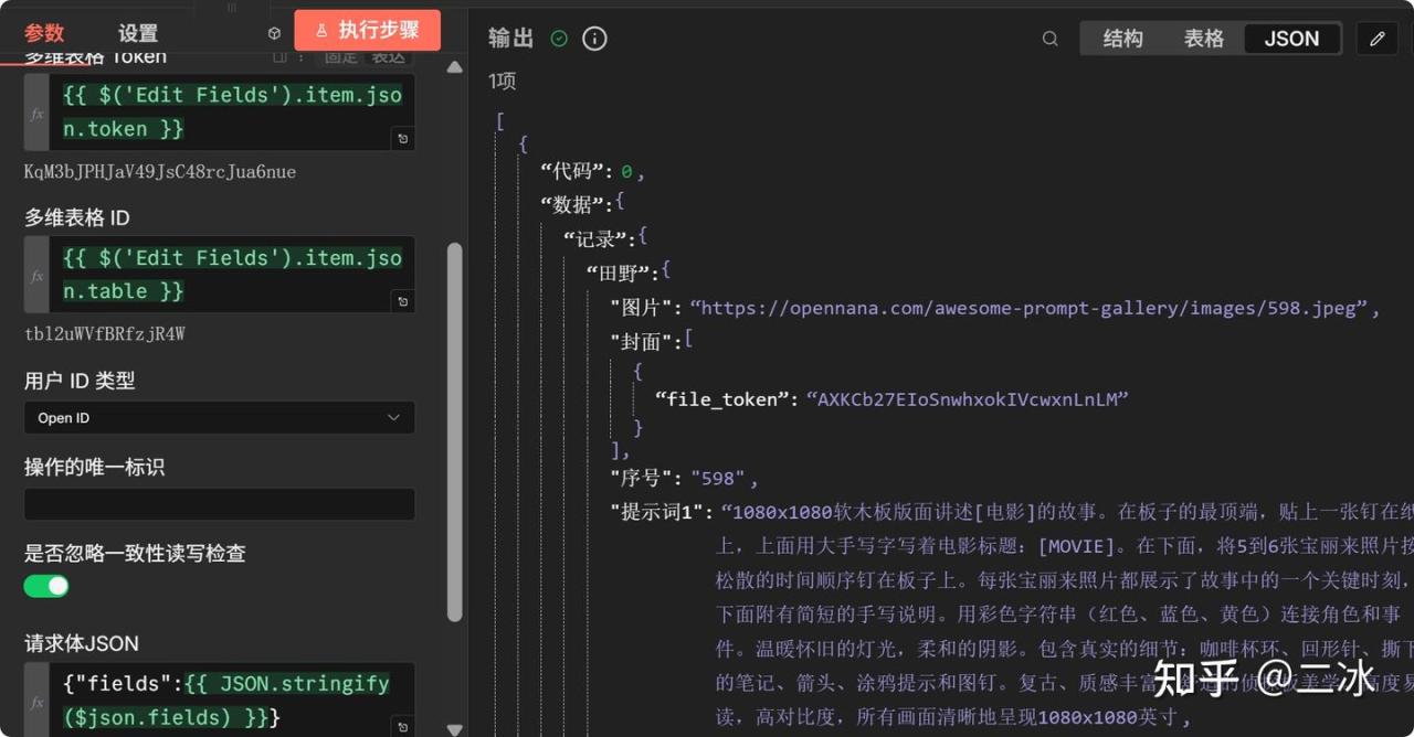 今天二冰带大家手搓一个工作流,两步走:先用HTTP请求把这900多条数据扒下来存到n8n自带的数据库里(这就当个缓存站),然后再自动把图片上传到飞书,最后把标题、提示词、标签、封面图全自动写入飞书多维表格。