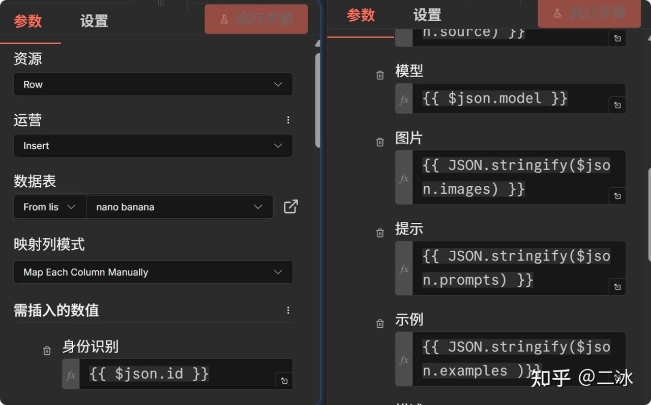 配置很简单,选择Insert row模式,把HTTP请求回来的字段(Title, Prompt, Images等)一一映射进去。