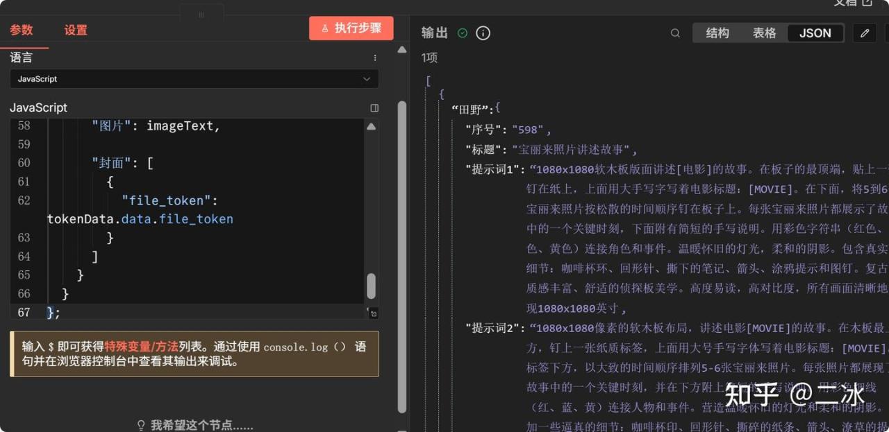 增加一个代码节点组装飞书请求体,代码我也放在文末的实战文档中,需要的兄弟自取