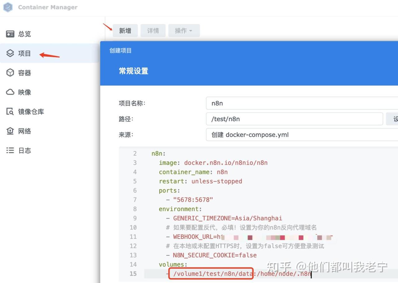 在群晖上部署 n8n 非常简单,老宁依然推荐使用 Docker-compose 的方式,方便管理和配置。