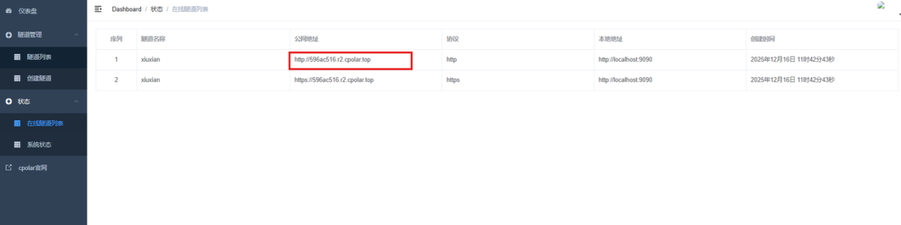 创建成功后,打开左侧在线隧道列表,可以看到刚刚通过创建隧道生成了公网地址,接下来就可以在其他电脑或者移动端设备(异地)上,使用地址访问。