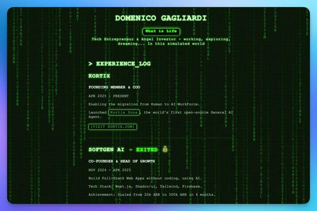 Dom 的个人主页设计非常酷,他其实还有很多失败项目,也作为天使投资人投过一些产品,都可以在他的主页看到