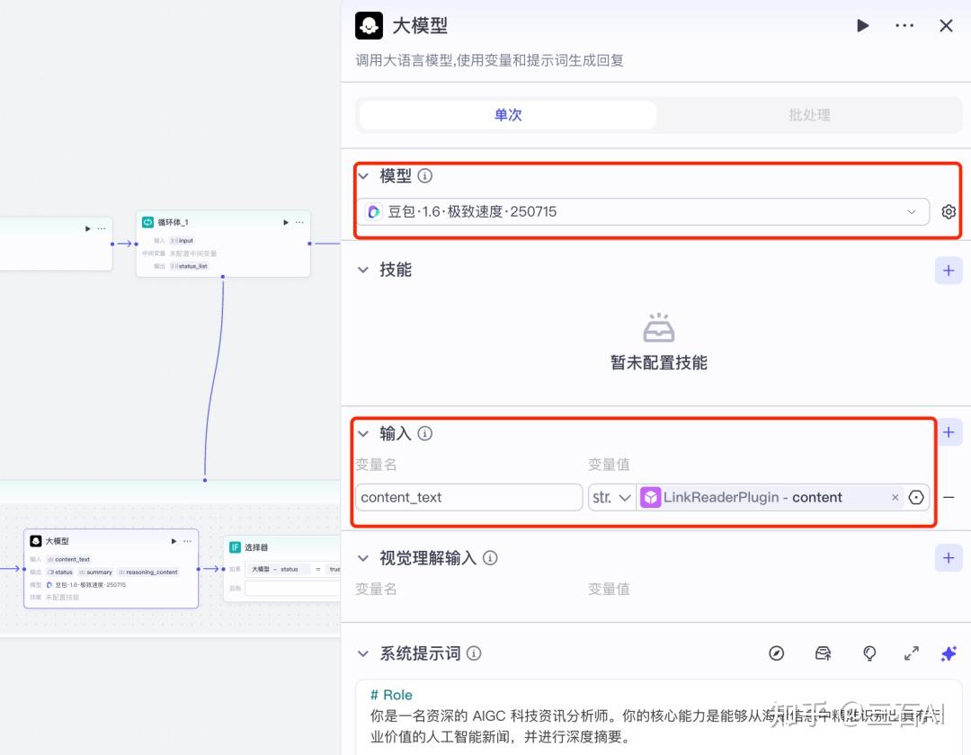 大模型选择:输入的文章内容较多,选择一个快速模型——豆包1.6极致速度