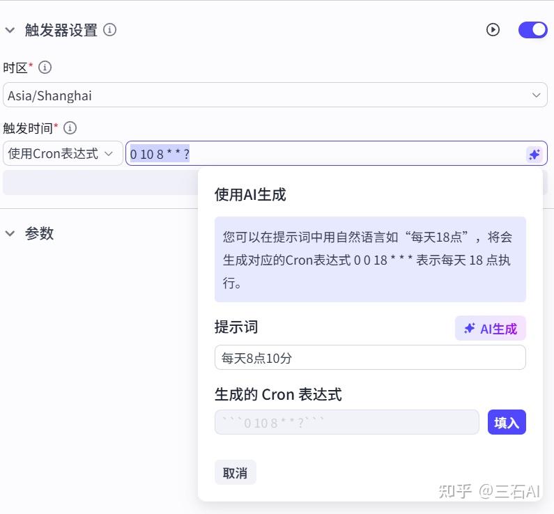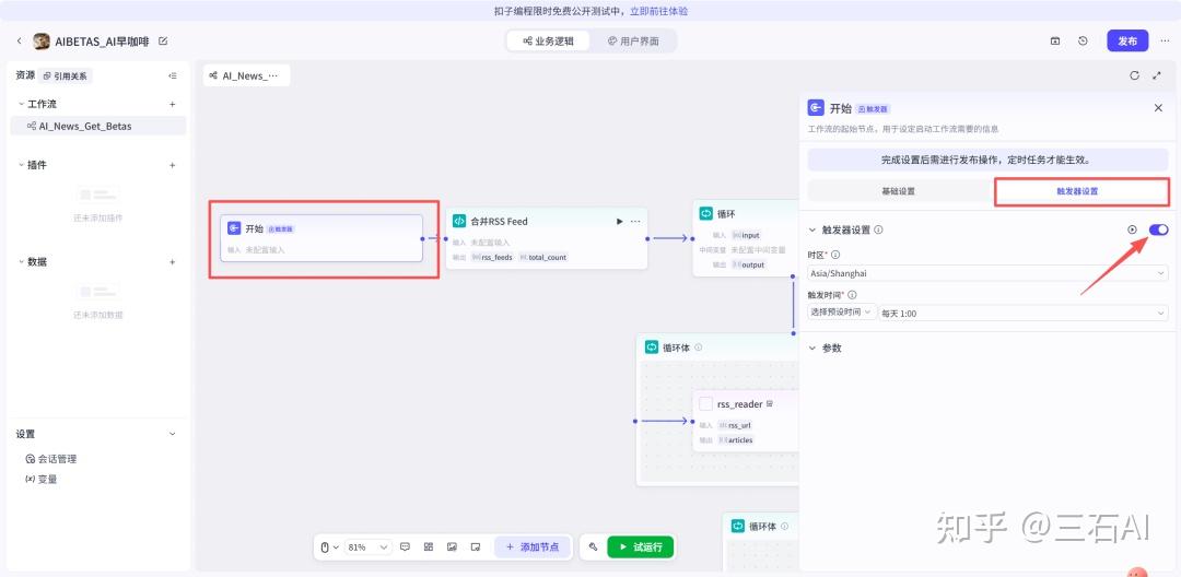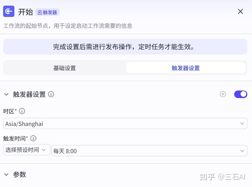 点击开始节点,我们可以看到触发器设置,打开开关,这样我们就可以创建一个定时任务