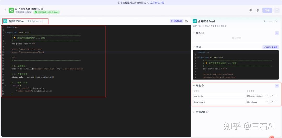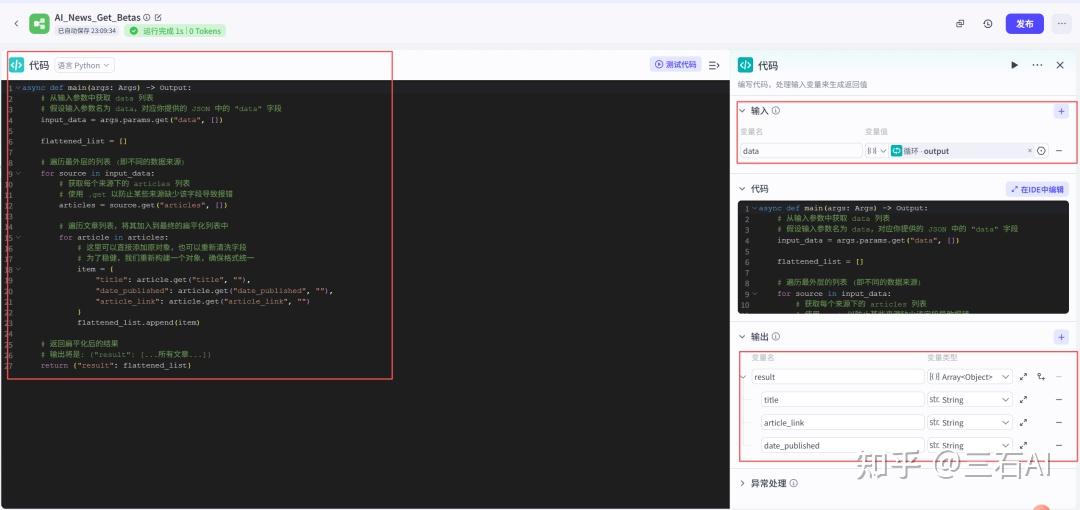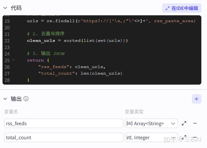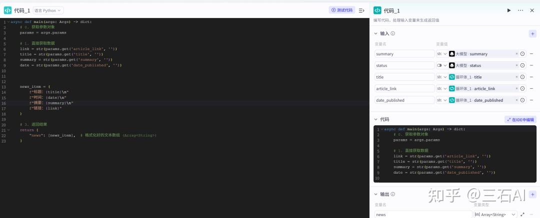 判断完成后增加一个代码节点,将清洗的数据和原来的url、标题等组合输出,方便我们汇总输入到大模型进行总结