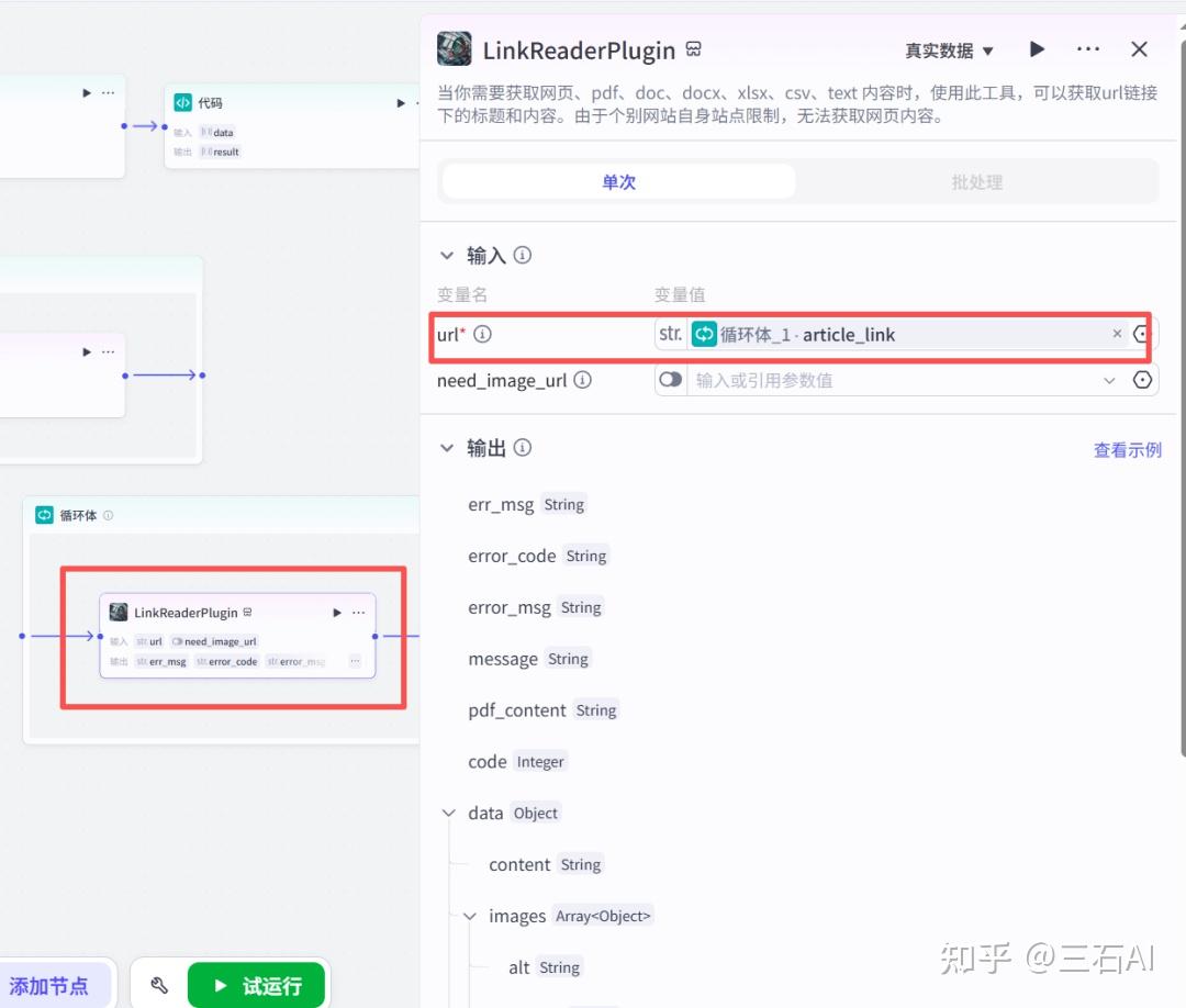 新闻读取:添加官方的链接读取节点,输入循环节点对应的文章链接-article_link,可以帮助你阅读文章内容并输出