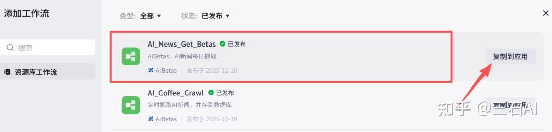 选择我们刚刚创建的工作流,注意工作流必须发布之后才能导入,点击复制到应用