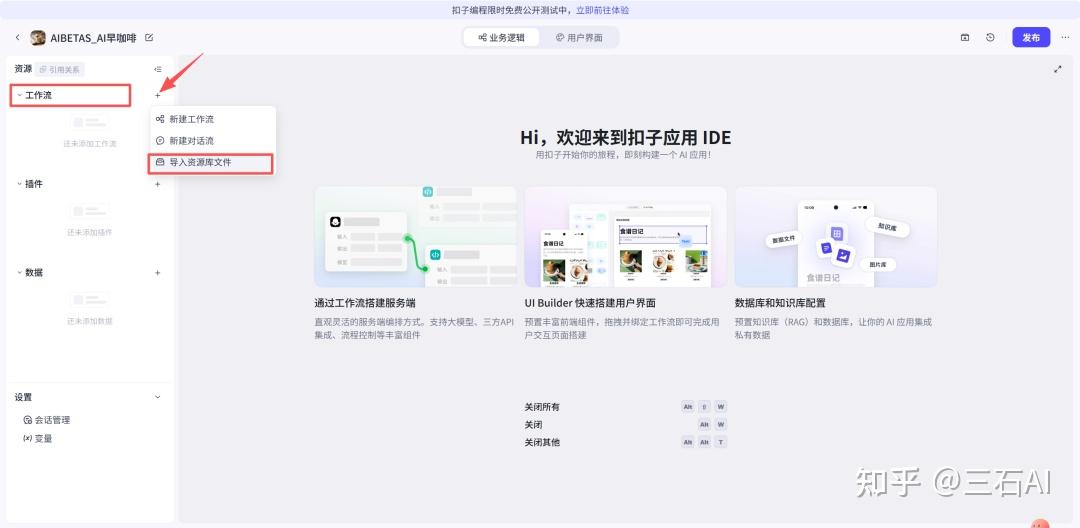 不要被进来的页面吓到,点击工作流旁边的+号,选择导入资源库文件