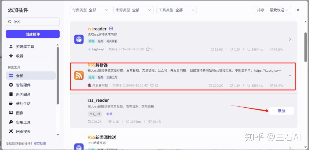 添加RSS解析插件:添加节点-插件-RSS,有比较多的第三方工具可以选择,我这里用的是RSS解析器