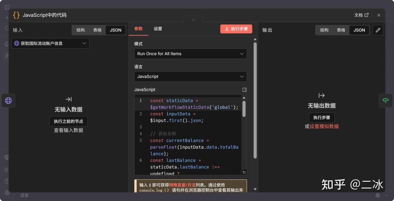 这一步是灵魂。我们用一段JS代码来计算差值,并更新n8n的“记忆”。代码我已经帮大家写好了,直接复制进去就行。