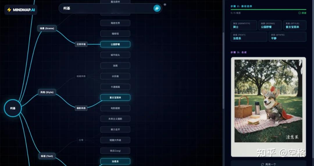 比如说我输入一个柯基,它会利用AI去获取到跟柯基相关的一些词汇,以思维导图的形式展示。
