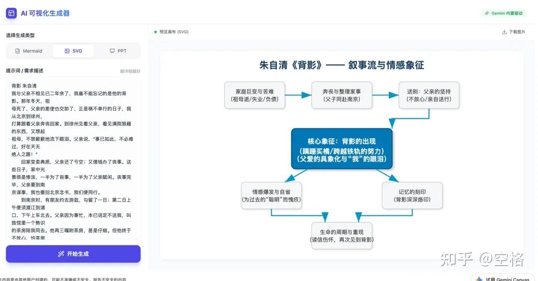 这是一个将文本通过AI可视化为流程图、SVG、Html-PPT的生成器。我这里是随便搜了一个文章叫背影,它生成了一个关于这篇文章的一个逻辑路线图。样式简约美观。