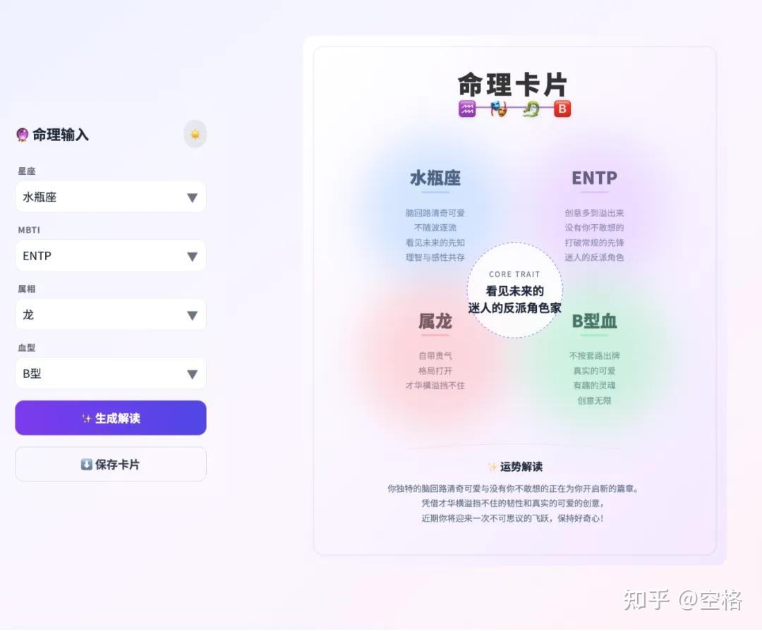 输入星座、MBTI、属相、血型,就能获取到一张命理解读的卡片,一种结合了中西方新型命理分析,非常好玩。如下: