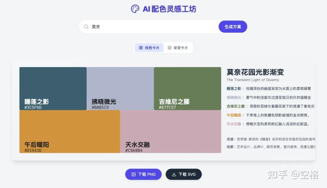 这个应用的是配色卡片生成,比如我输一个莫奈,获取到了一个莫奈的一个主题颜色。这里面它有它推荐的睡莲池塘拂晓日出,下面有色纸。