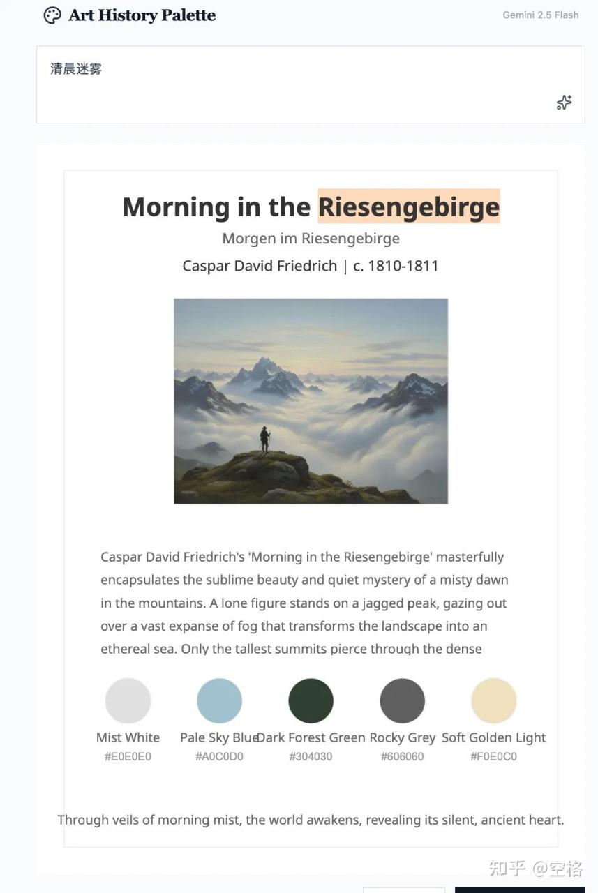 我输入了一个清晨迷雾,它就给我推荐了一个印象日出的一个画作,还介绍了一个画的背景,推荐了几个画一个配色。