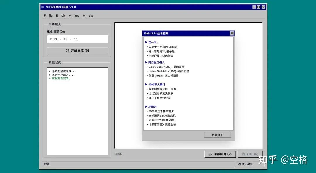 同日生日的名人,1999年这一天的大事,还有这一年的冷知识,这非常有意思,而且整个设计是用了复古的windows风格。