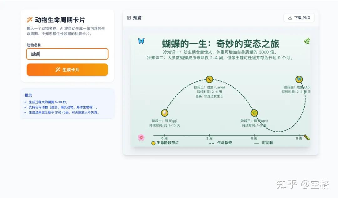 上面标题下是一个关于蝴蝶的冷知识:蝴蝶的生命周期虽短,但它们的幼虫在几周内增加到出生时的3000倍。然后下面是第一周、第四周、第八周的整个生命过程的描述。这个卡片也可以下载成PNG。