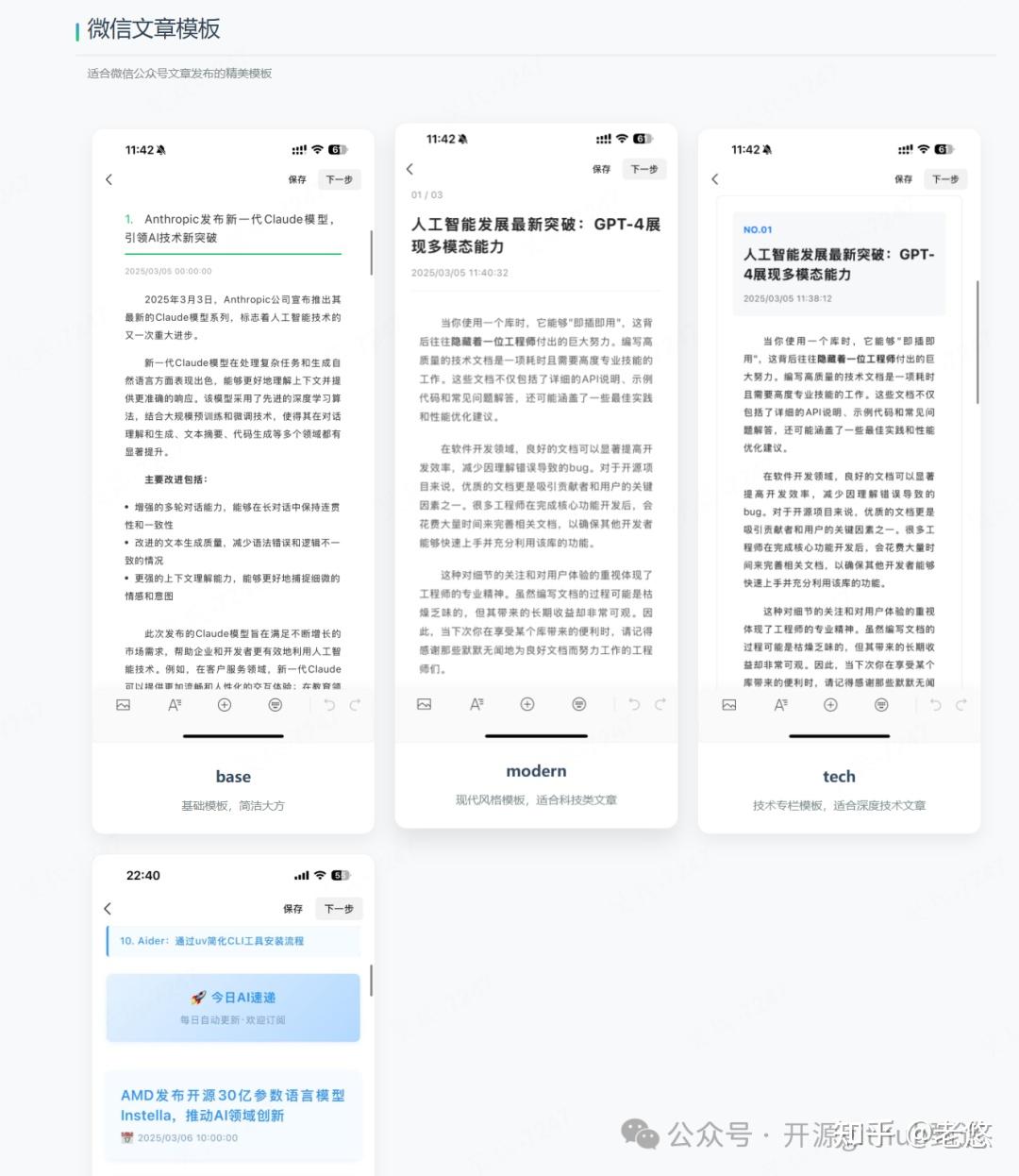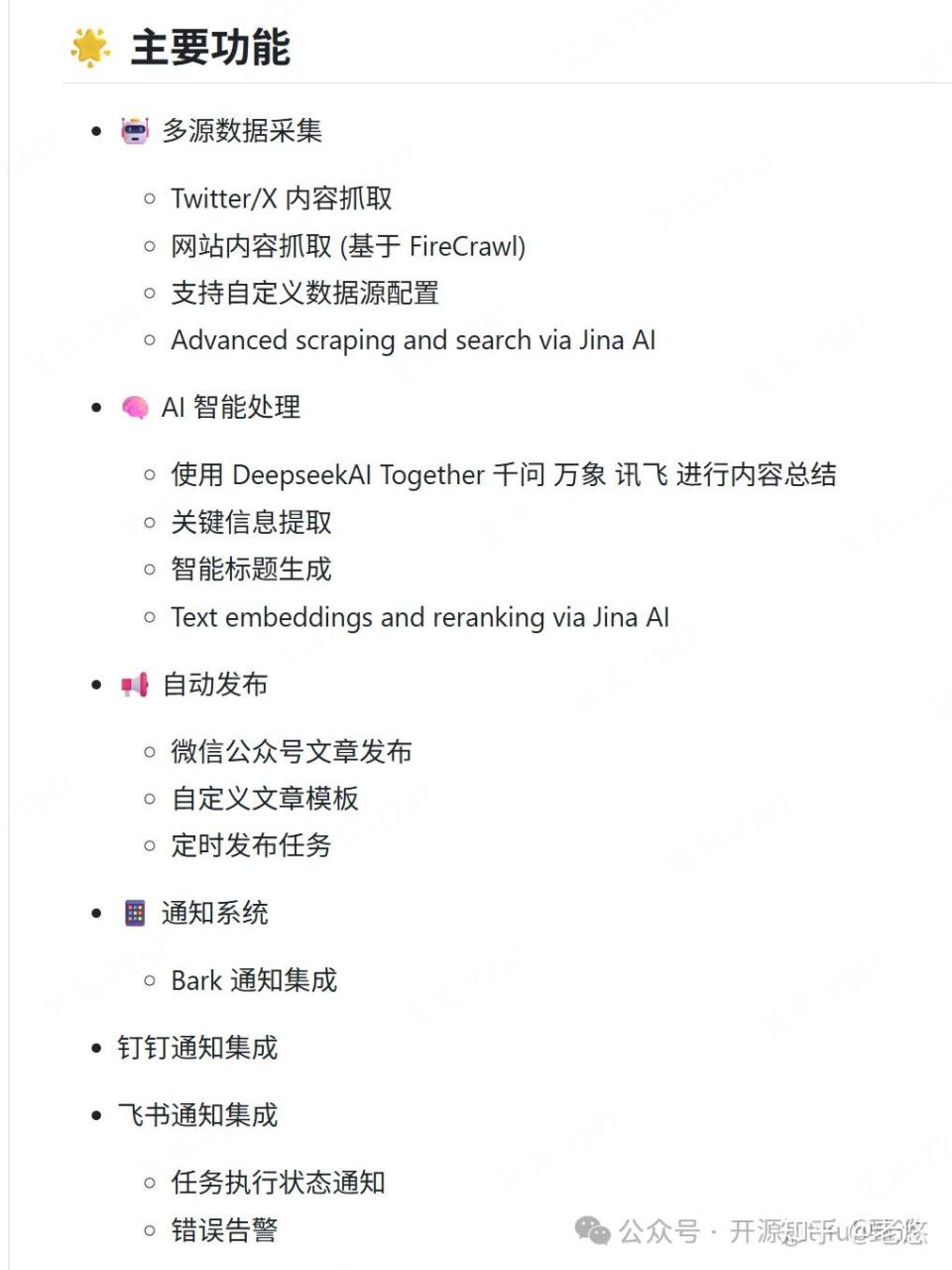 而且有很多美观的公众号模板可选,不光不需要自己敲字了,排版的麻烦也一并省去。这个开源项目集成钉钉、飞书等通知渠道,支持 Docker 和直接部署两种方式:
