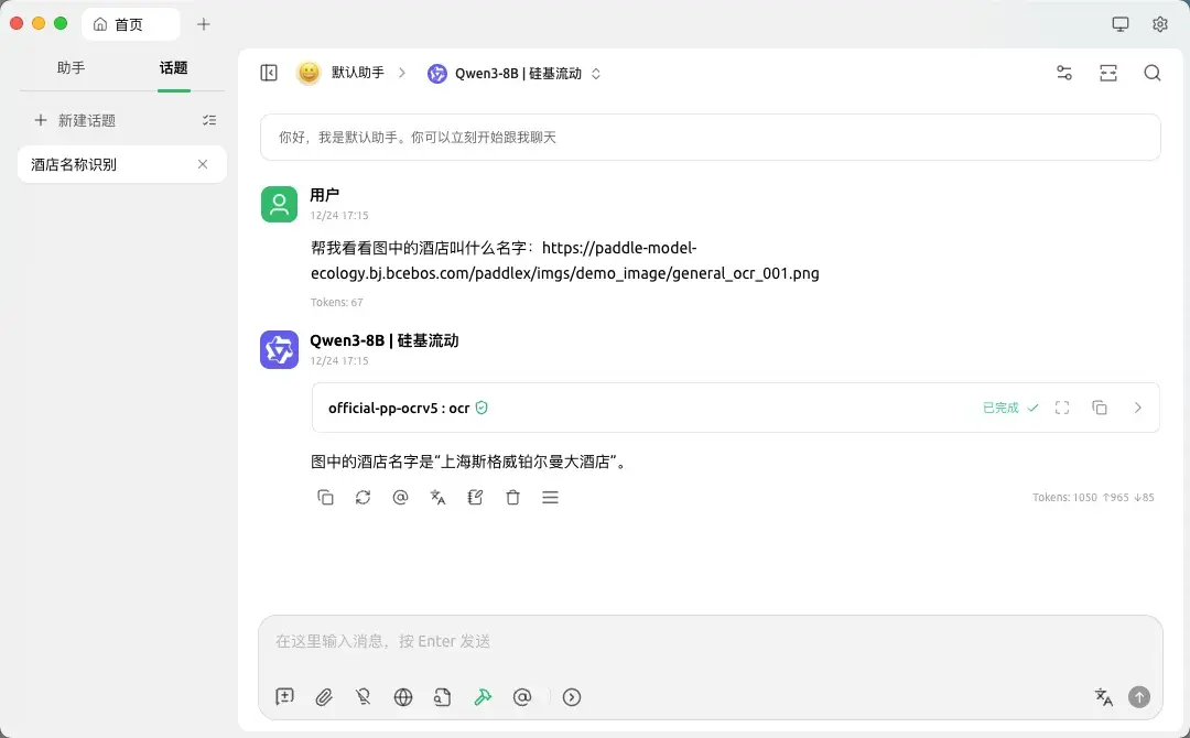 我也在 Cherry Studio 里试了试效果。花了不到一分钟复制粘贴 MCP 配置,然后使用 PaddleOCR 官网提供的 PP-OCRv5 MCP server 来识别图像中的酒店名称: