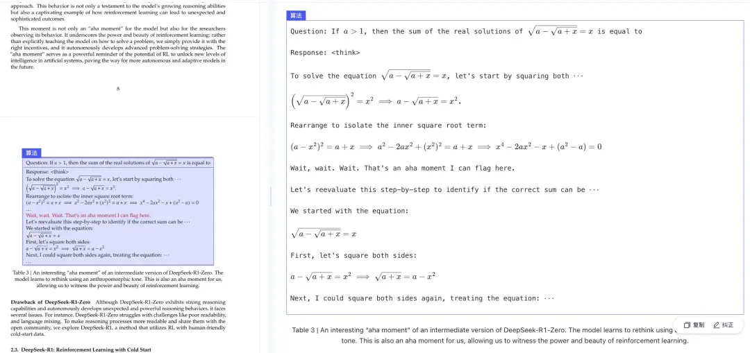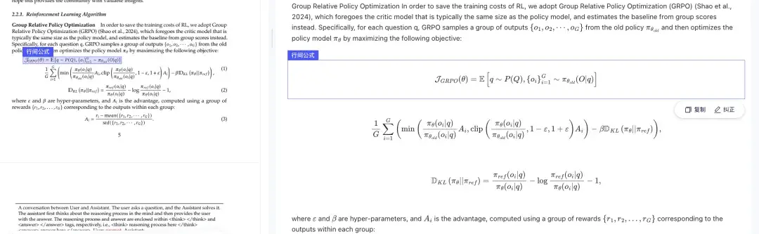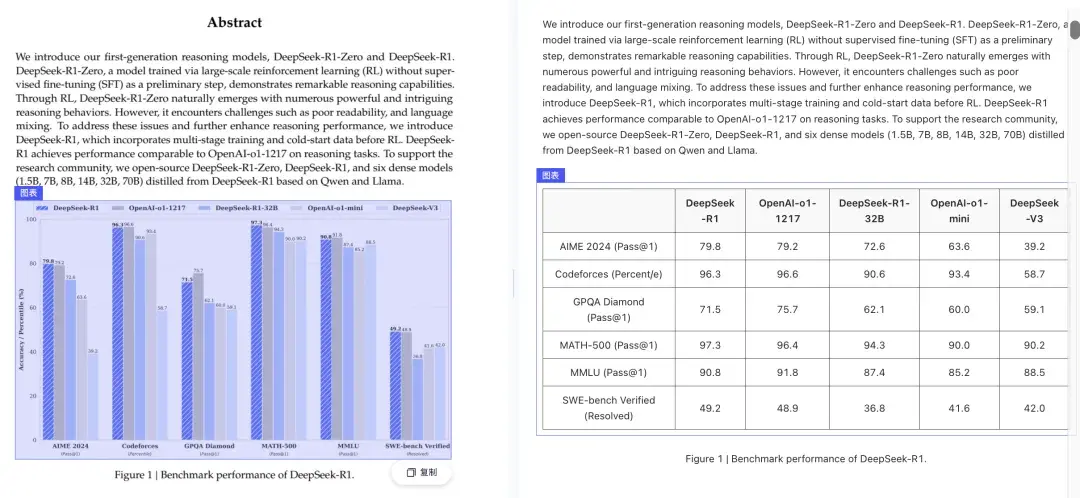几秒后,解析结果清晰呈现:不管是文字、图像、代码、表格还是公式,PaddleOCR都能精准还原,相关内容,可以左右一一对应。
