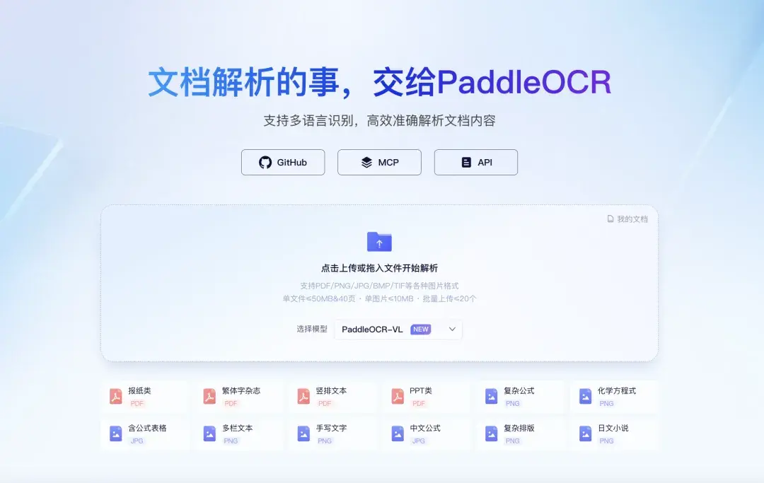 打开官网,你会看到三个核心入口:GitHub 开源地址、MCP 接口、API 接口。下方支持直接上传图像或 PDF,体验 PaddleOCR 的三大模型方案: