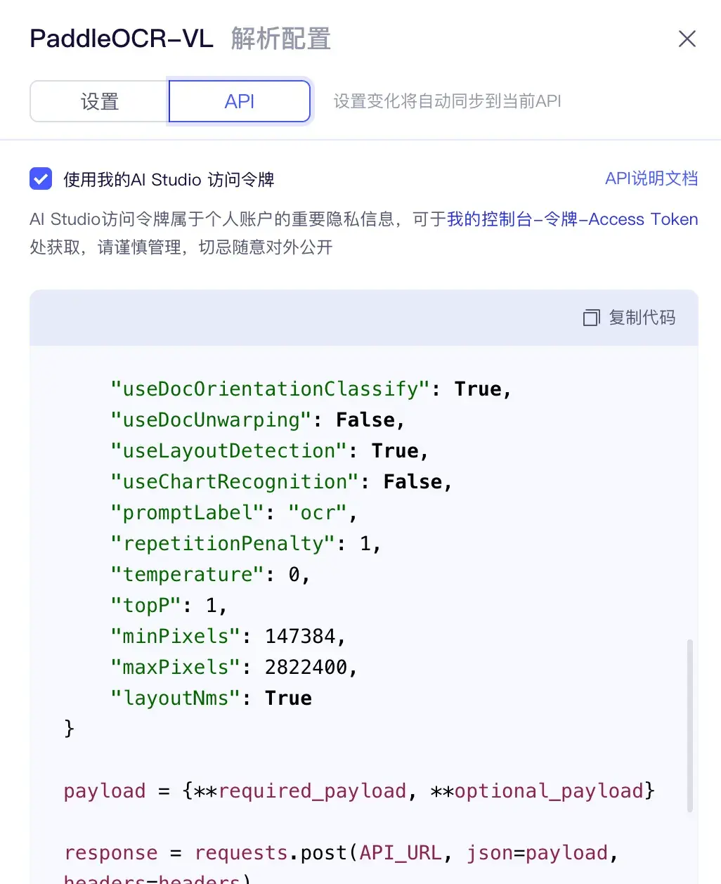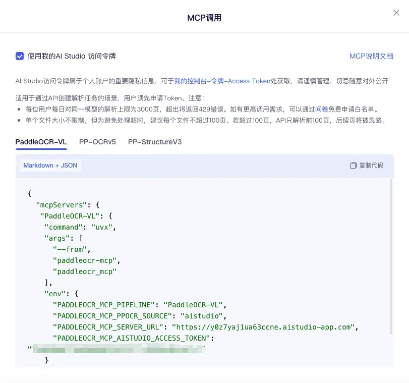 PaddleOCR官网首页已直接提供了 API 和 MCP 的调用示例,点击就可以有对应的弹窗,亲测带上token,复制可以跑。这里以 API 为例,MCP类似。