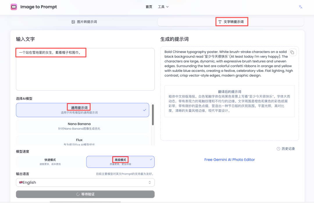 等几分钟后,提示词就出来了,有中文和英文,优先使用英文。