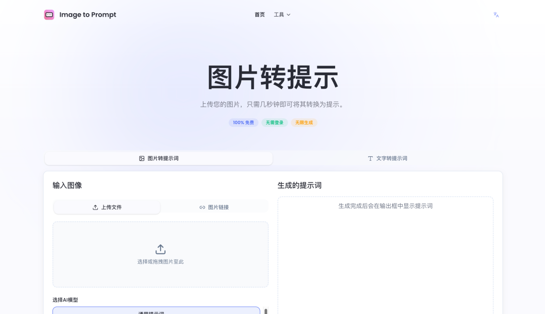 这是一个完全免费把图片转换成提示词的AI工具,它不用登录,而且可以无限生成。