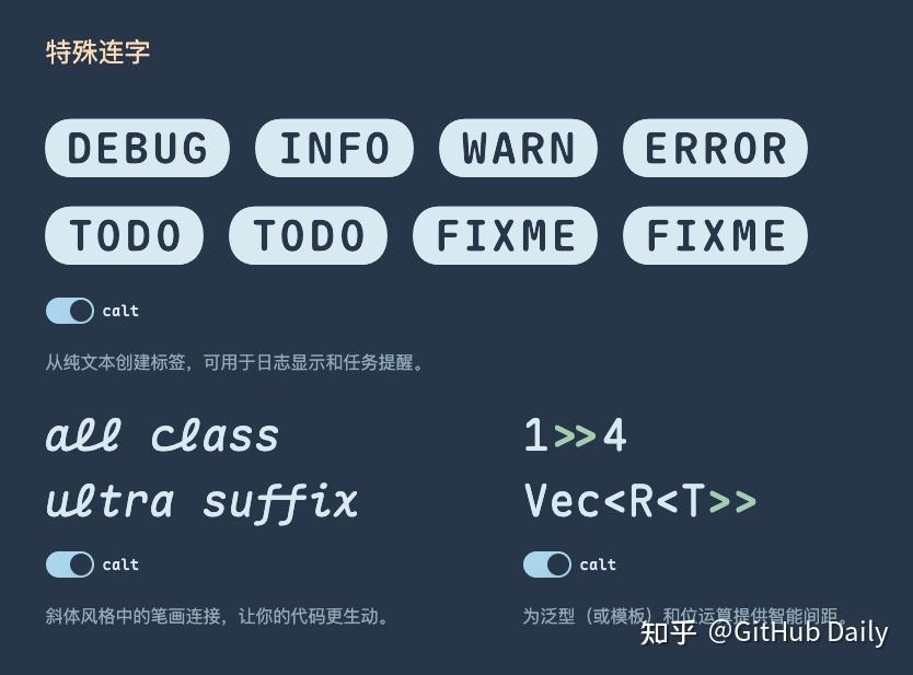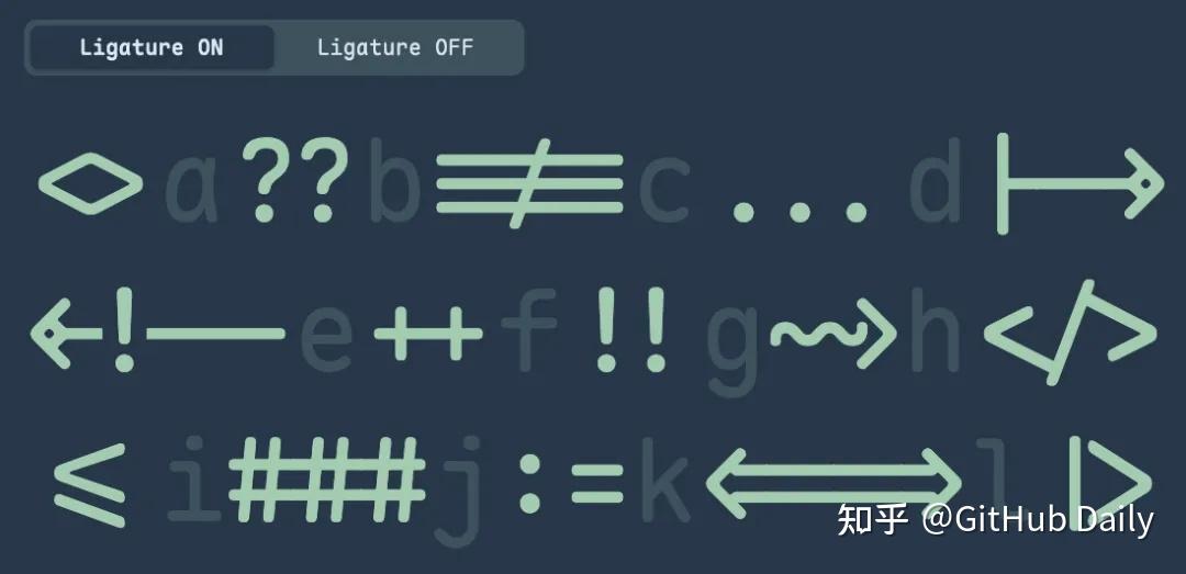作为一个现代的编程字体,Ligatures(连字)功能自然是标配。