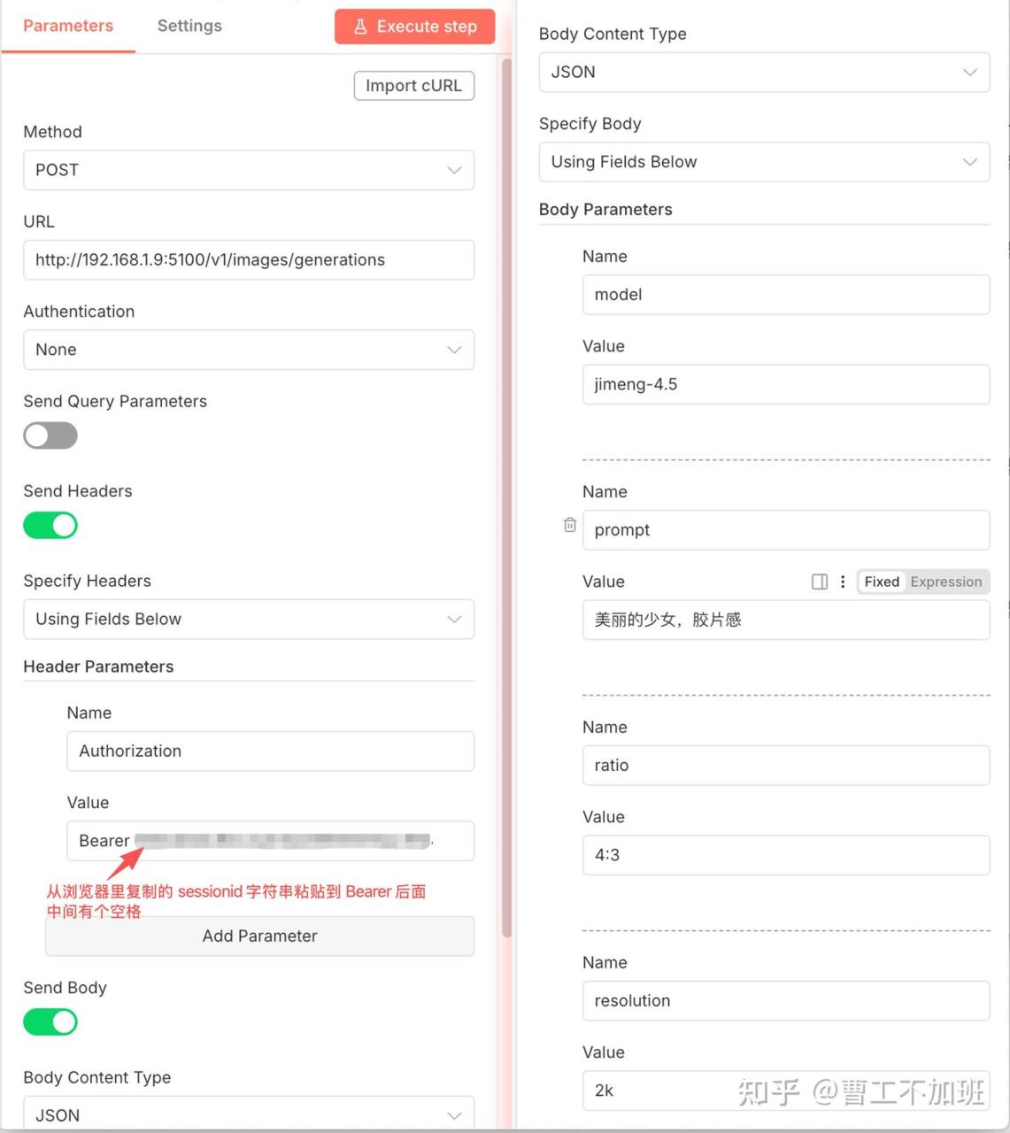 Authorization,值为Bearer加上刚才复制的sessionid(注意中间有个空格)。 - Body: 这里填生成参数,比如模型