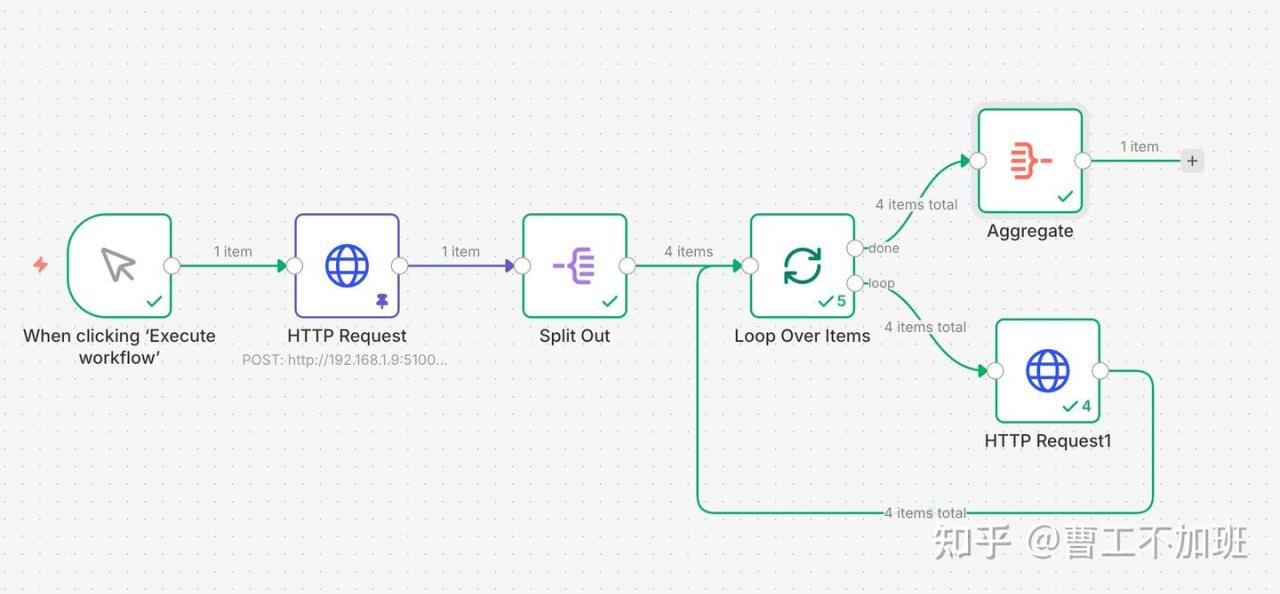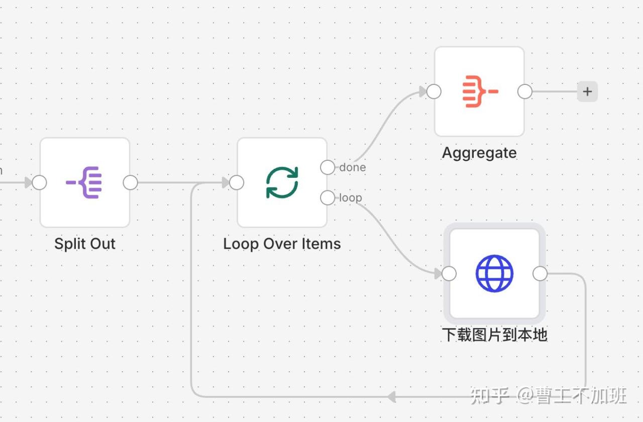 我在工作流里加了一个 Split Out 节点,把返回的图片数组拆成单条数据。接着通过 Loop Over Items 循环节点,配合 HTTP Request 节点把图片链接转化为二进制文件(Binary)。