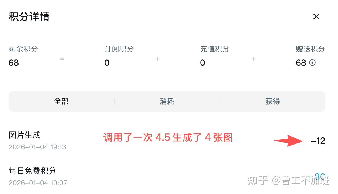 如果你像我一样选了 jimeng-4.5 模型,单张图是 3 积分,一次请求默认会生成 4 张图。这一波操作下去,12 积分就直接扣没了(普通模型是 1 积分一张)。大家调试的时候悠着点,别代码跑通了,号里的积分被循环跑空了。