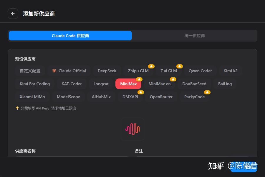 选择 Claude Code,点击 + 号,新增模型供应商。