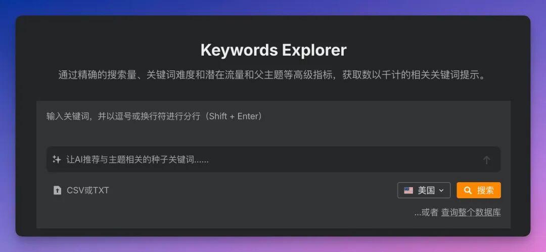 打开 Ahrefs 的关键词探索工具,搜索框留空,直接点搜索。这是个小技巧——不预设关键词,而是先看全局。