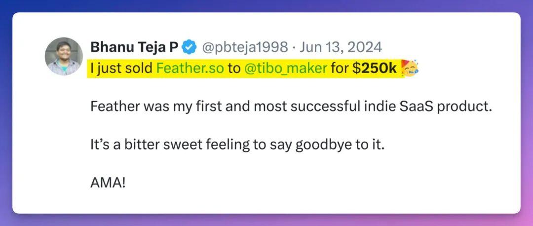 Bhanu 在 X 上发了条推特:“把 Feather 卖给 @tibo_maker 了,这是我第一个也是最成功的独立 SaaS 产品。挺复杂的心情,又开心又不舍。”