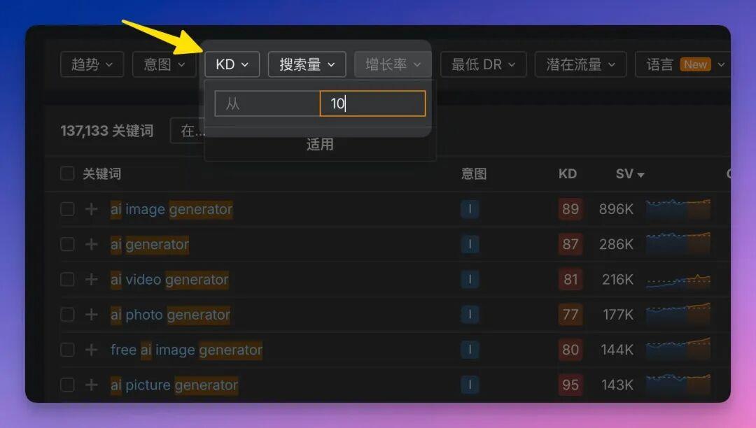 加上这个过滤条件后,那些竞争激烈的大词就被过滤掉了,剩下的都是“低垂的果实”。