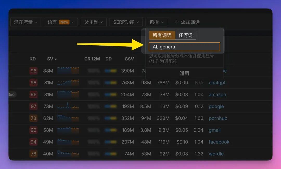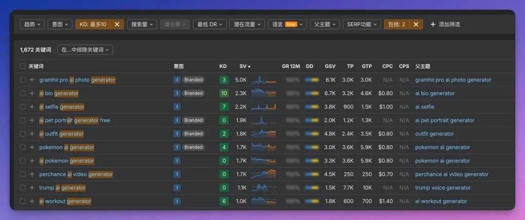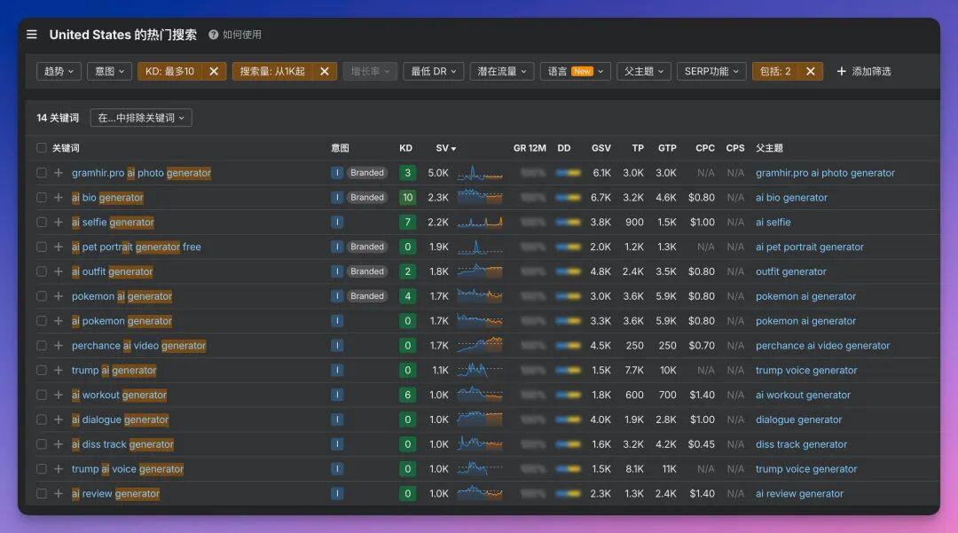 假设你做的是 AI 产品,就加上“AI”和“generator”两个过滤条件。一下子,所有“AI XX 生成器”类型的关键词就出来了。