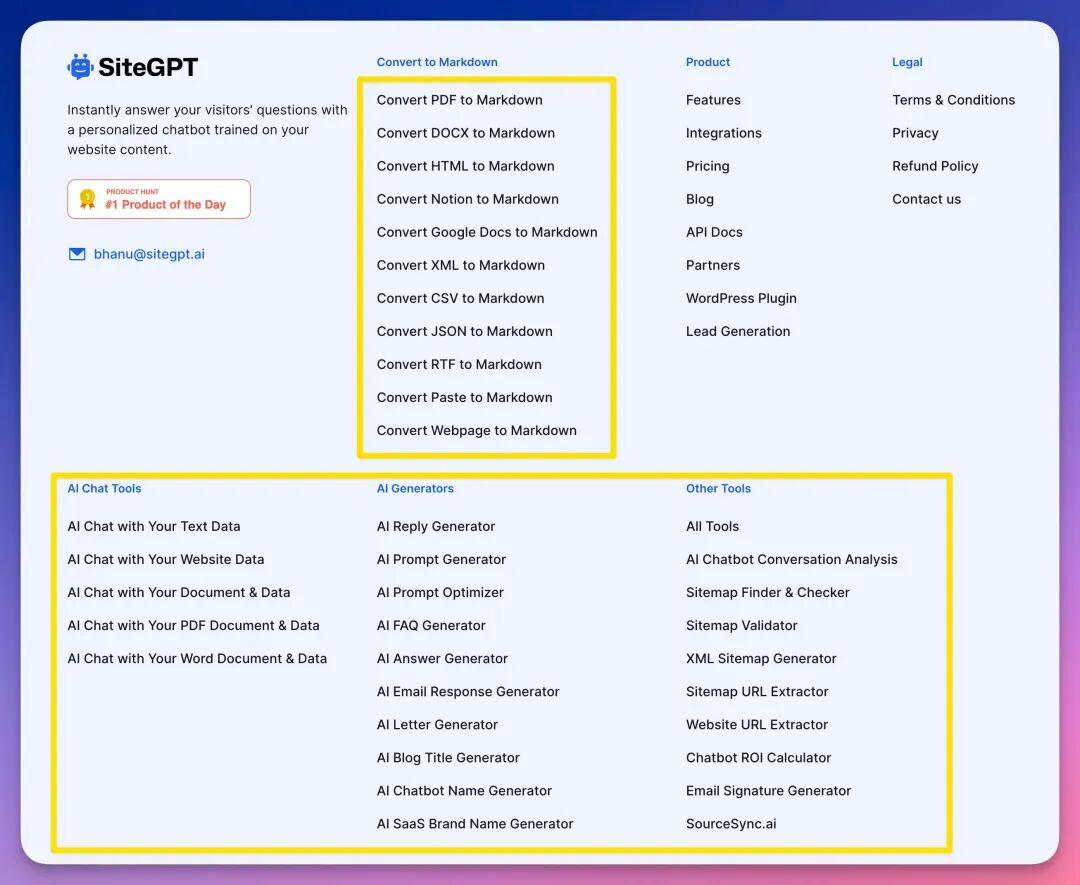这个玩法在国外叫 “Engineering as Marketing”,国内通常叫“工具内页”。Bhanu 围绕 SiteGPT 的目标用户群体,开发了 20 多个免费的 SEO 小工具——比如 XML Sitemap Generator、Robots.txt Checker、Meta Tag Analyzer 等。这些工具每个月给他带来超过 10 万次的自然流量,其中一部分会转化成 SiteGPT 的付费用户。
